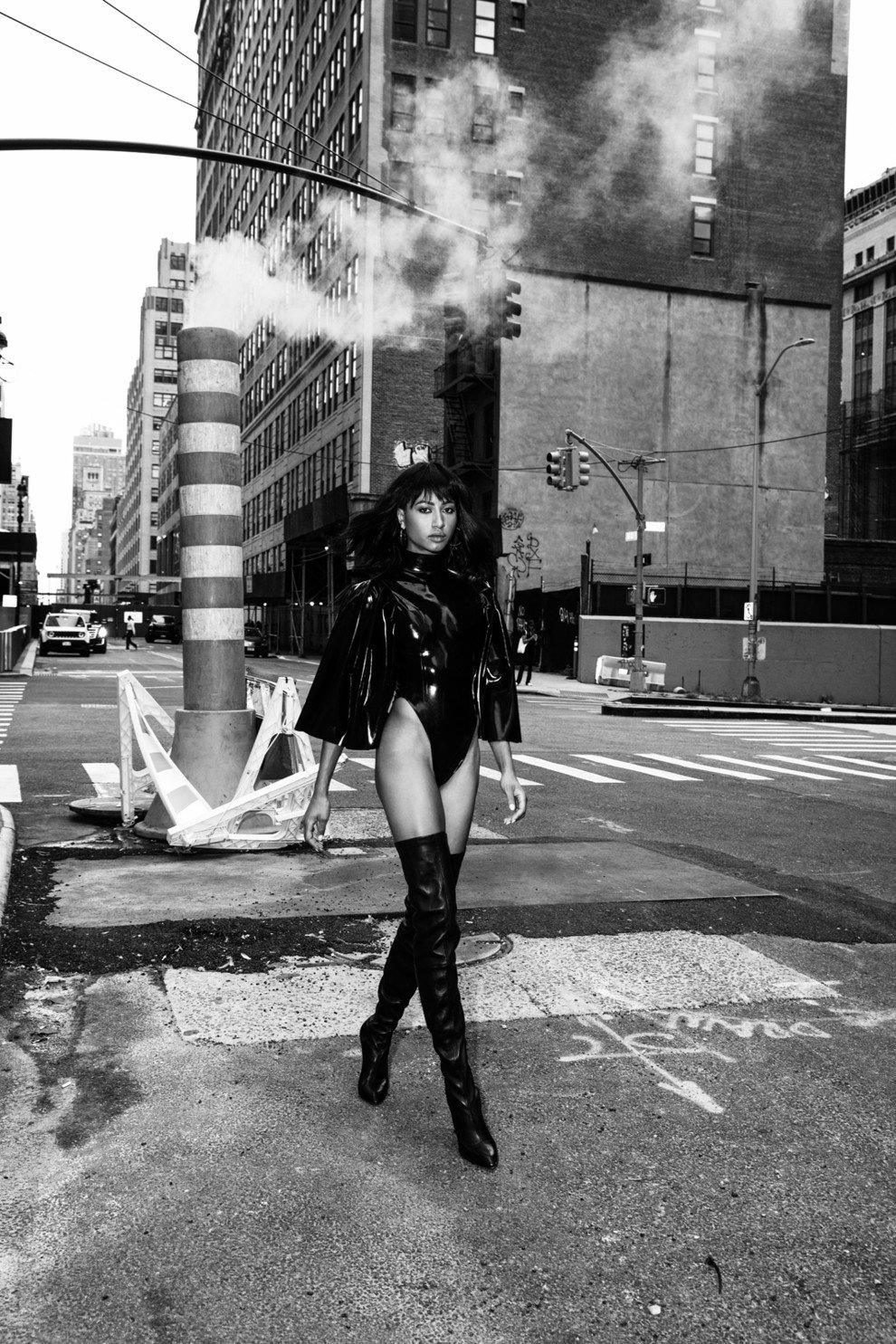 Latex bodysuit, BLACKLICKORISH; leather boots, CHRISTIAN LOUBOUTIN; earrings, brass, VERSACE